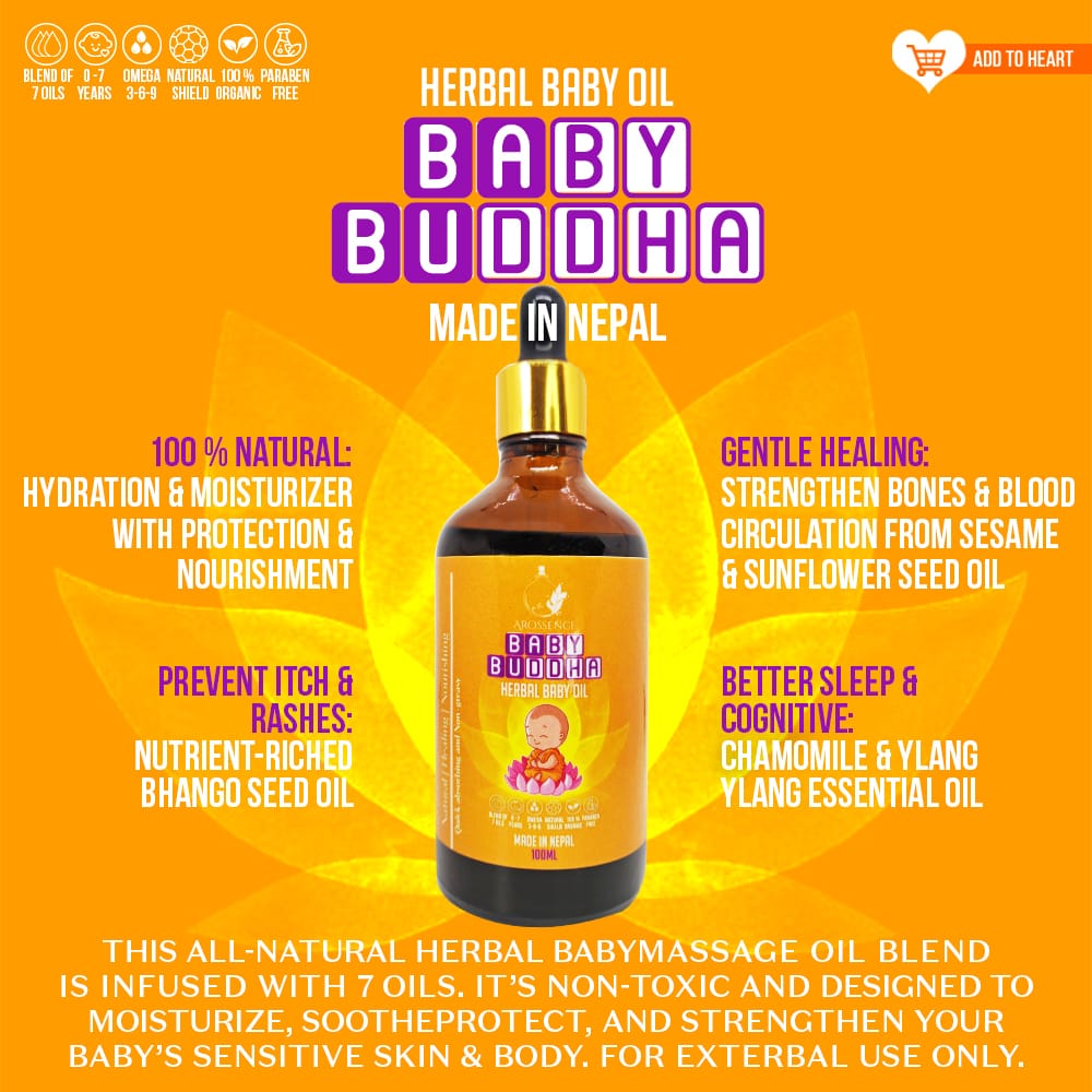 Introducing “Baby Buddha” by Arossence, a herbal baby oil crafted with ancient wisdom and a holistic approach. Embracing the nurturing essence of Mother Nature, this gentle oil supports the holistic development of a newborn’s mind, body, and soul.