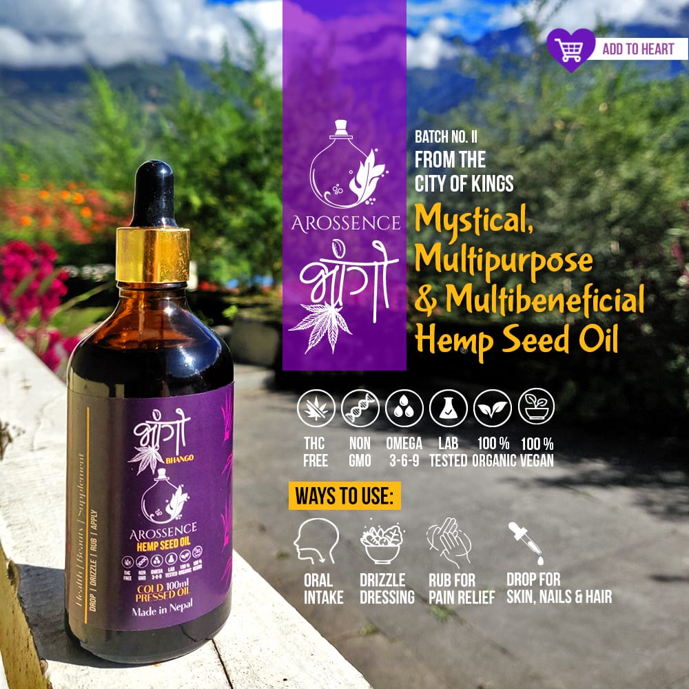 “Bhango” Cold Pressed Hemp Seed Oil, is the finest and purest hemp seed oil crafted with care and precision in the serene landscapes of Nepal. This 100% organic, THC-free oil is packed with essential Omega 3, 6, and 9 fatty acids, making it a multipurpose elixir for your health and wellness needs.